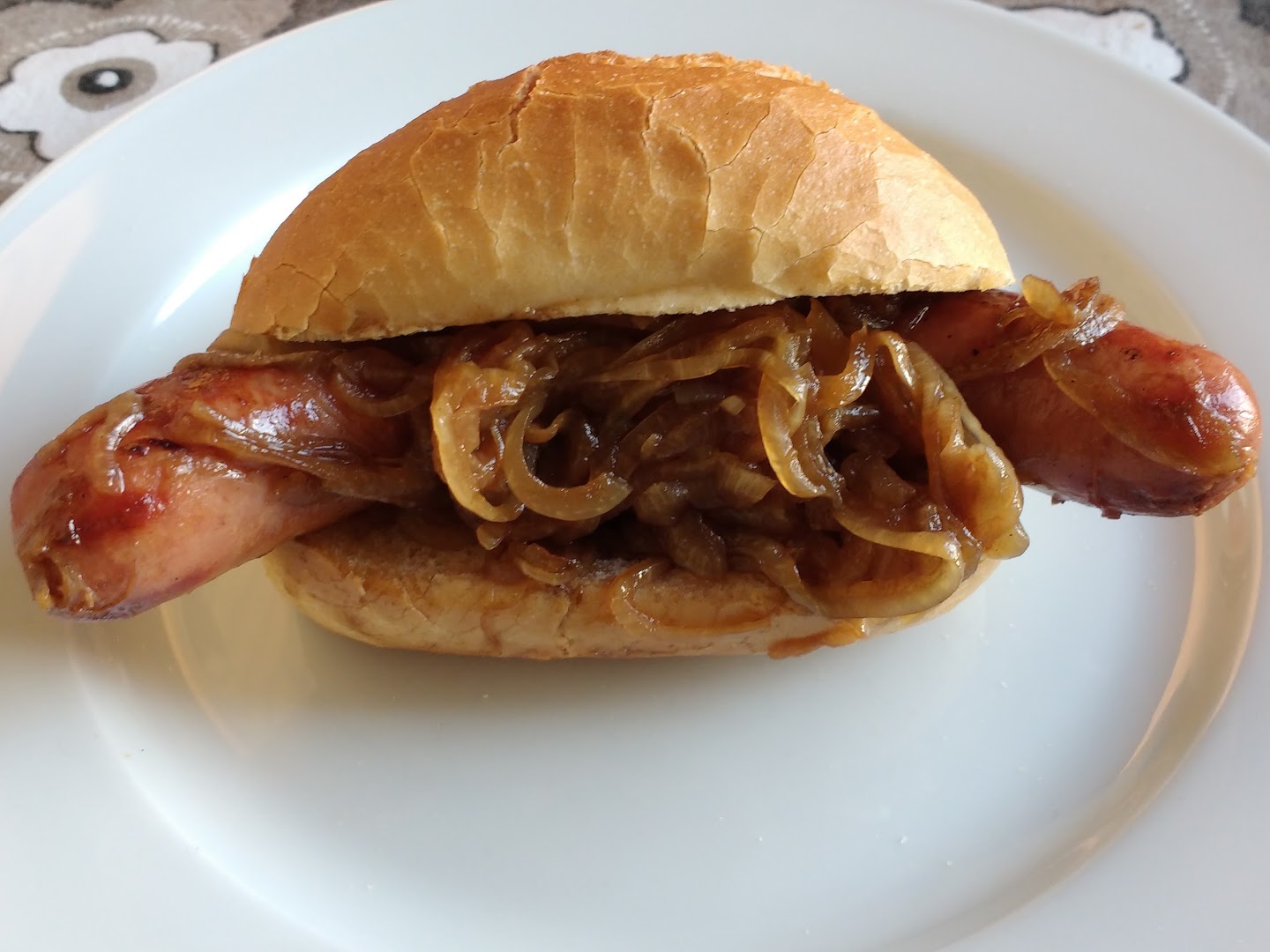 In der Pfanne/ im Dutch Oven servieren. Jetzt noch ein Brötchen aufschneiden, etwas Senf, eine Wurst und ein guten Schlag der Zwiebeln hinein geben und genießen. Mmmmmhh, lecker, saftig - Vorsicht Kleckergefahr.